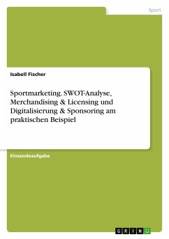 Einsendeaufgabe aus dem Jahr 2024 im Fachbereich Sport - Sportökonomie, Sportmanagement, Note: 1,3, Deutsche Hochschule für Prävention und Gesundheitsmanagement GmbH, Veranstaltung: Sportmarketing, Sprache: Deutsch, Abstract: Die Arbeit befasst sich mit dem Thema des Sportmarketings. Genauer befasst sie sich mit den Themengebieten der SWOT-Analyse, Merchandising & Licensing, Digitalisierung & Sponsoring. Dazu wird in einem ersten Schritt die SWOT-Analyse anhand des Beispiels des Deutschen-Schwimm-Verbandes (DSV) näher erläutert, bevor sich in einem zweiten Schritt eine praktische Anwendung der Thematik Merchandising & Licensing sowie Digitalisierung anhand eines Vereinsjubiläums anschließt. Abschließend wendet sich die Arbeit noch exemplarische dem Thema Sponsoring anhand eines Laufevents zu.