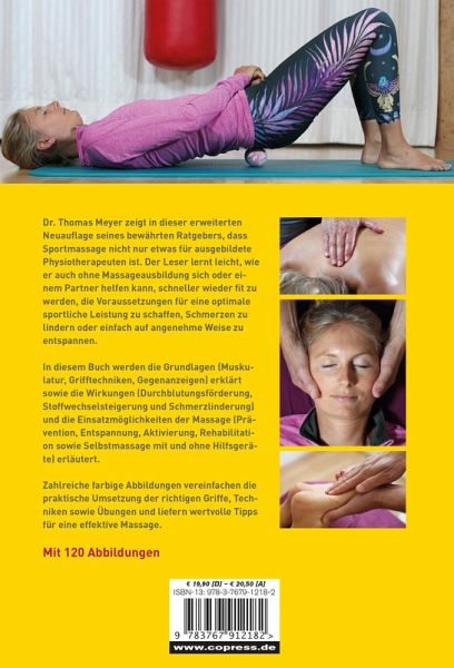 Thomas Meyer zeigt in dieser überarbeiteten Neuauflage seines bewährten Ratgebers, dass Sportmassage nicht nur etwas für ausgebildete Physiotherapeuten ist. Der Leser lernt leicht, wie er auch ohne Massageausbildung sich oder einem Partner helfen kann, schneller wieder fit zu werden, die Voraussetzungen für eine optimale sportliche Leistung zu schaffen oder einfach auf angenehme Weise zu entspannen.In diesem Buch werden die Grundlagen (Muskulatur, Grifftechniken, Gegenanzeigen) erklärt sowie die Wirkungen (Durchblutungsförderung, Stoffwechselsteigerung) und die Einsatzmöglichkeiten der Massage (Prävention, Entspannung und Aktivierung) erläutert.Zahlreiche farbige Abbildungen vereinfachen die praktische Umsetzung der richtigen Griffe und liefern wertvolle Tipps für eine effektive Massage.