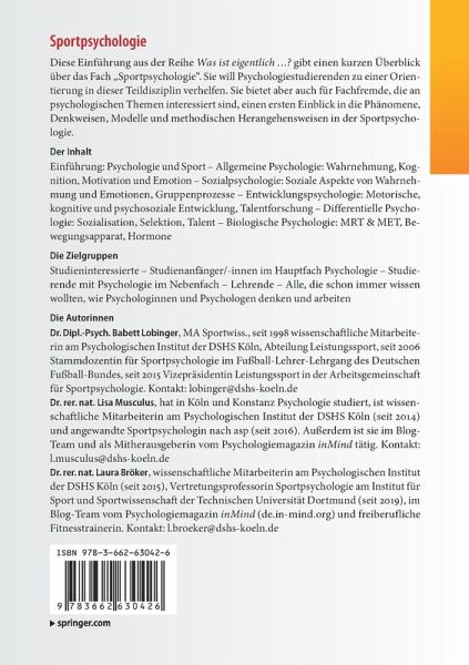 Dr. Dipl.-Psych. Babett Lobinger, MA Sportwiss., seit 1998 wissenschaftliche Mitarbeiterin am Psychologischen Institut der DSHS Köln, Abteilung Leistungssport, seit 2006 Stammdozentin für Sportpsychologie im Fußball-Lehrer-Lehrgang des Deutschen Fußball-Bundes, seit 2015 Vizepräsidentin Leistungssport in der Arbeitsgemeinschaft für Sportpsychologie. Kontakt: lobinger@dshs-koeln.de Dr. rer. nat. Lisa Musculus, hat in Köln und Konstanz Psychologie studiert, ist wissenschaftliche Mitarbeiterin am Psychologischen Institut der DSHS Köln (seit 2014) und angewandte Sportpsychologin nach asp (seit 2016). Außerdem ist sie im Blog-Team und als Mitherausgeberin vom Psychologiemagazin inMind tätig. Kontakt: l.musculus@dshs-koeln.de Dr. rer. nat. Laura Bröker, wissenschaftliche Mitarbeiterin am Psychologischen Institut der DSHS Köln (seit 2015), Vertretungsprofessorin Sportpsychologie am Institut für Sport und Sportwissenschaft derTechnischen Universität Dortmund (seit 2019), im Blog-Team vom Psychologiemagazin inMind (de.in-mind.org) und freiberufliche Fitnesstrainerin. Kontakt: l.broeker@dshs-koeln.de