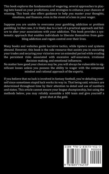 This book explores the fundamentals of wagering, several approaches to placing bets based on your predictions, and strategies to enhance your chances of winning. This book also offers guidance to help you master your thoughts, emotions, and finances, even in the event of a loss in your wager. Suppose you are unable to overcome your gambling addiction or problem gambling. In that case, it is likely due to a lack of a practical approach and failure to alter your associations with your addiction. This book provides a systematic approach that enables individuals to liberate themselves from gambling addiction and regain control over their lives. Many books and websites guide lucrative tactics, while tipsters and systems abound. However, this book is the sole resource that assists you in executing your trades and securing your victories over an extended period while evading the persistent risks associated with excessive self-assurance, irrational decision-making, and emotional influences. No matter how good your choices may be, you will always be vulnerable to significant losses unless you possess the ability to wager with the composed mindset and rational approach of the experts. If you believe that no luck is involved in fantasy football, you're deluding yourself since sometimes stupid luck works its way in. That being said, winners are determined throughout time by their attention to detail and use of numbers and states. This article cannot ensure your league championship, but using the methods below, you may reliably assemble a 600 team and give yourself a great shot at the gold.
