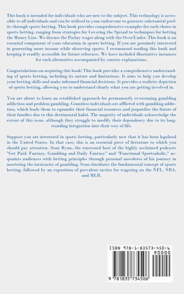 This book is intended for individuals who are new to the subject. This technology is accessible to all individuals and can be utilised in your endeavor to generate substantial profits through sports betting. This book provides comprehensive examples for each choice in sports betting, ranging from strategies for Covering the Spread to techniques for betting the Money Line. We discuss the Parlay wager along with the Over/Under. This book is an essential component of your education in sports betting. If you are genuinely interested in generating more income while observing sports, I recommend reading this book and keeping it readily accessible for future reference. We have included illustrative instances for each alternative accompanied by concise explanations. Congratulations on acquiring this book! This book provides a comprehensive understanding of sports betting, including its nature and limitations. It aims to help you develop your betting skills and make informed financial decisions. It provides a realistic depiction of sports betting, allowing you to understand clearly what you are getting involved in. You are about to learn an established approach for permanently overcoming gambling addiction and problem gambling. Countless individuals are afflicted with gambling addiction, which leads them to squander their financial resources and jeopardise the future of their families due to this detrimental habit. The majority of individuals acknowledge the extent of this issue, although they struggle to modify their dependency due to its longstanding integration into their way of life. Suppose you are interested in sports betting, particularly now that it has been legalized in the United States. In that case, this is an essential piece of literature to which you should pay attention. Sean Ryan, the renowned host of the highly acclaimed podcasts "Get Paid: Fantasy, Gambling and Daily Fantasy" and "Functional Sportaholic," acquaints audiences with betting principles through personal anecdotes of his journey in mastering the intricacies of gambling. Sean elucidates the fundamental concept of sports betting, followed by an exposition of prevalent tactics for wagering on the NFL, NBA, and MLB.