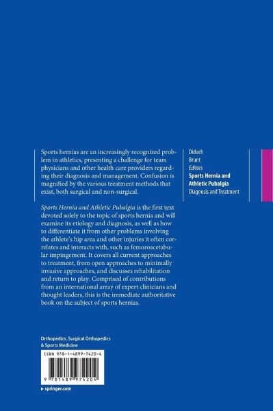 Sports Hernia - Anatomy: What Is a Sports Hernia?- Epidemiology of Groin Injuries in Athletes.- Differential Diagnosis of Groin Pain in Athletes.- Hip Pathology That Can Cause Groin Pain in Athletes: Diagnosis and Management.- The Role of Femoroacetabular Impingement in the Etiology of Athletic Pubalgia and Sports Hernias.- Hip Dysplasia.- Sports Hernia - History and Physical Examination: Making the Diagnosis with Confidence.- Imaging of Athletic Groin Pain.- The Role of the Team Physician and Athletic Trainer, Including Non-Operative Management.- The Open, All-Suture Repair Technique for the Treatment of Athletic Pubalgia.- Surgical Treatment of Sports Hernia: Open Mesh Approach.- Surgical Treatment of Sports Hernia: Laparoscopic Approach.- Surgical Treatment of Sportsman's Groin: The Minimal Repair Technique (Muschaweck-Repair).- Sportsman's Groin and the Inguinal Ligament Release Procedure.- Adductor Injuries and the Role of Adductor Tenotomy for Groin Pain in Athletes.- Ancillary Modalities in the Treatment of Athletic Groin Pain.- Rehabilitation and Return to Activity Following Sports Hernia Surgery.