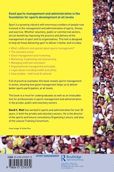 Sport is a growing industry with enormous numbers of people now involved in the management and administration of sports, fitness and exercise. Whether voluntary, public or commercial sectors, all can benefit by improving the practice and delivery of the management of sport and its organisations. This text is designed to help all those delivering sport to deliver it better and includes: · What's different and special about sports management? · The voluntary sector · Event management and marketing · Marketing, fundraising and sponsorship · Managing staff and volunteers · Organisational management principles · Legal issues including health and safety · Case studies - both local and national. Full of practical examples this book reveals sports management in action, showing how good management helps us to deliver better sports participation, at all levels. This book is a must for undergraduates as well as an invaluable tool for professionals in sport management and administration in the private public and voluntary sectors.