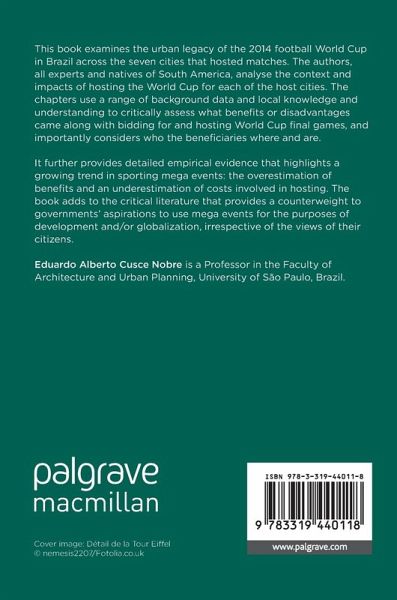 This book examines the urban legacy of the 2014 football World Cup in Brazil across the seven cities that hosted matches. The authors, all experts and natives of South America, analyse the context and impacts of hosting the World Cup for each of the host cities. The chapters use a range of background data and local knowledge and understanding to critically assess what benefits or disadvantages came along with bidding for and hosting World Cup final games, and importantly considers who the beneficiaries where and are.