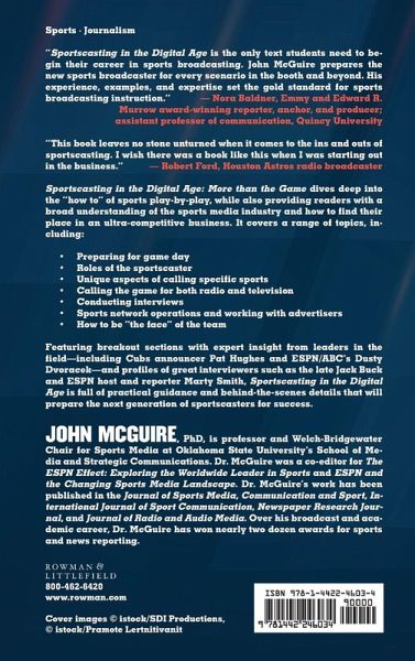 Sportscasting in the Digital Age: More than the Game is a much-needed textbook that not only dives deep into the "how to" of sports play-by-play, but also gives students a broader understanding of the sports media industry and how to find their place in an ultra-competitive business. It covers a range of topics, including: Preparing for game dayRoles of the sportscasterUnique aspects of calling specific sportsCalling the game for both radio and televisionConducting interviewsSports network operations and working with advertisersHow to be "the face" of the team Featuring breakout sections with expert insight from leaders in the field-including Cubs announcer Pat Hughes and ESPN/ABC's Dusty Dvoracek-and profiles of great interviewers such as the late Jack Buck and ESPN host and reporter Marty Smith, Sportscasting in the Digital Age is full of practical guidance and behind-the-scenes details that will prepare the next generation of sportscasters for success.
