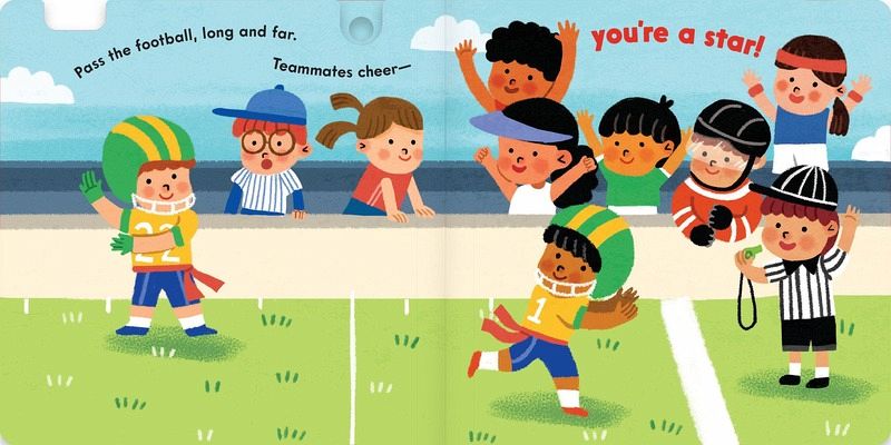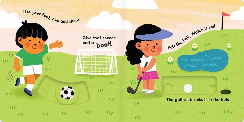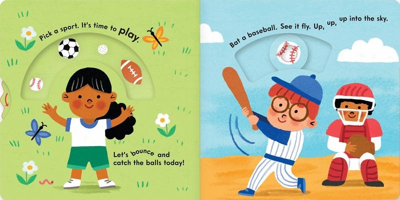 Pick a sport. It's time to play. Let's bounce and catch balls today! This action-packed board book celebrates favorite sports—from baseball and basketball to golf, hockey, and football. Little ones can spin the cover to see 8 sports balls. Inside, move sliders and spinners and pull and push tabs to make the balls move. Babies can bat the baseball, kick the soccer ball, putt the golf ball, slap the hockey puck, serve the tennis ball, bump the volley ball, shoot the basketball, and pass the football. With bright and colorful illustrations, sturdy moving parts, this book is a slam dunk for busy babies and sporty toddlers!
