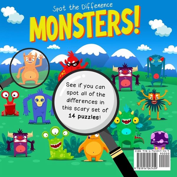 Welcome to Spot The Difference - Monsters! See if you can spot what's different in these 14 double-page picture puzzles! Each puzzle set contains two scenes that are almost identical - all you need to do is search for what's changed; a monster might've swapped color, lost an arm... or gained an extra eye or two! Answers are located at the end of the book, so the perfect place to check what's correct and find any you missed. A great, interactive book for little ones who love to puzzle solve. Ideal for rainy days and car journeys.