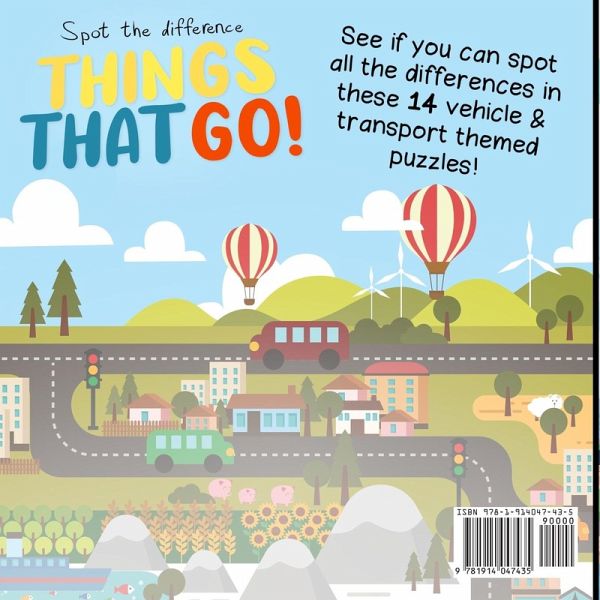 Welcome to Spot The Difference - Things that Go! See if you can spot what's different in these 14 double-page picture puzzles! Each puzzle set contains two scenes that are almost identical - all you need to do is search for what's changed; a car might've swapped color, a tractor could've lost a wheel... or a boat could've gained a sail! Answers are located at the end of the book, so the perfect place to check what's correct and find any you missed. A great, interactive book for little ones who love to puzzle solve. Ideal for rainy days and car journeys.