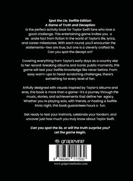 Spot the Lie, Swiftie Edition: Find the Truth & False game for Swifties is the perfect activity book for Taylor Swift fans who love a good challenge. This entertaining game invites you to separate fact from fiction in the world of Taylor's life, lyrics, and career milestones. With each round, you'll encounter three statements-two are true, but one is a cleverly crafted lie. Can you spot the deception? Covering everything from Taylor's early days as a country star to her record-breaking albums and iconic public moments, this game will test your Swiftie knowledge like never before. From easy warm-ups to head-scratching challenges, there's something for every level of fan. Artfully designed with visuals inspired by Taylor's albums and eras, this book is more than a game-it's a journey through the music, stories, and achievements that define her legacy. Whether you're playing solo, with friends, or hosting a Swiftie trivia night, this book guarantees hours of fun. Get ready to test your instincts, celebrate your fandom, and uncover just how much you truly know about Taylor Swift. Can you spot the lie, or will the truth surprise you? Let the game begin.