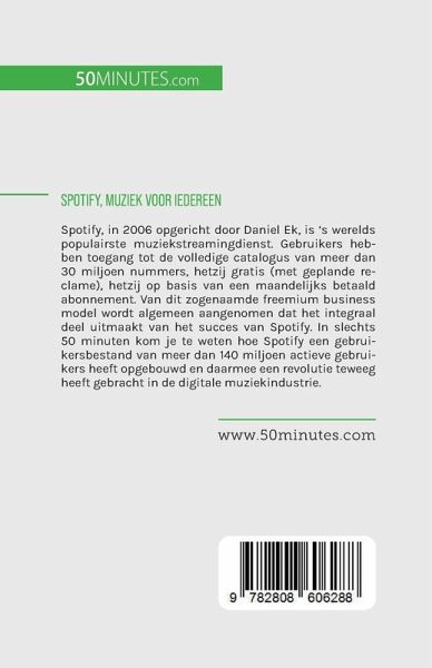Spotify, in 2006 opgericht door Daniel Ek, is 's werelds populairste muziekstreamingdienst. Gebruikers hebben toegang tot de volledige catalogus van meer dan 30 miljoen nummers, hetzij gratis (met geplande reclame), hetzij op basis van een maandelijks betaald abonnement. Van dit zogenaamde freemium business model wordt algemeen aangenomen dat het integraal deel uitmaakt van het succes van Spotify. In slechts 50 minuten kom je te weten hoe Spotify een gebruikersbestand van meer dan 140 miljoen actieve gebruikers heeft opgebouwd en daarmee een revolutie teweeg heeft gebracht in de digitale muziekindustrie. Dit beknopte boek geeft je een inleiding tot de belangrijkste kritiek op Spotify en de geheimen van het succes van de website. Een gedetailleerde evaluatie van de vorderingen van het bedrijf tot nu toe, een bespreking van de belangrijkste concurrenten en een analyse van de toekomstperspectieven van de site geven je alles wat je moet weten over de site die een pionier was op het gebied van digitaal streamen.