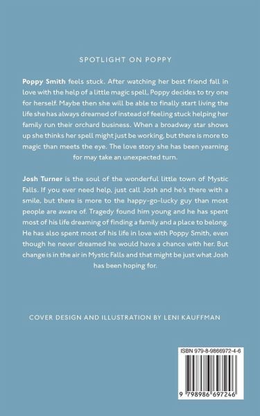 Poppy Smith feels stuck. After watching her best friend fall in love with the help of a little magic spell, Poppy decides to try one for herself. Maybe then she will be able to finally start living the life she has always dreamed of instead of feeling stuck helping her family run their orchard business. When a broadway star shows up she thinks her spell might just be working, but there is more to magic than meets the eye. The love story she has been yearning for may take an unexpected turn. Josh Turner is the soul of the wonderful little town of Mystic Falls. If you ever need help, just call Josh and he's there with a smile, but there is more to the happy-go-lucky guy than most people are aware of. Tragedy found him young and he has spent most of his life dreaming of finding a family and a place to belong. He has also spent most of his life in love with Poppy Smith, even though he never dreamed he would have a chance with her. But change is in the air in Mystic Falls and that might be just what Josh has been hoping for.