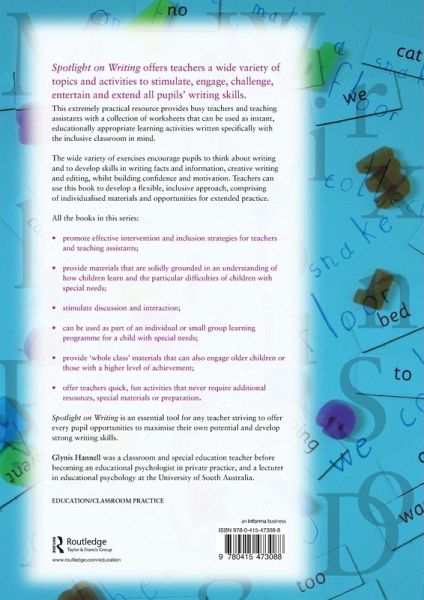 Spotlight on Writing offers teachers a wide variety of topics and activities to stimulate, engage, challenge, entertain and extend all pupils' writing skills. This extremely practical resource provides busy teachers and teaching assistants with a collection of worksheets that can be used as instant, educationally appropriate learning activities written specifically with the inclusive classroom in mind. The wide variety of exercises encourages pupils to think about writing and to develop skills in writing facts and information, creative writing and editing, whilst building confidence and motivation. Teachers can use this book to develop a flexible inclusive approach, comprising individualised materials and opportunities for extended practice. All the books in this series: Promote effective intervention and inclusion strategies for teachers and teaching assistants Provide materials that are solidly grounded in an understanding of how children learn and the particular difficulties of children with special needs. Stimulate discussion and interaction Can be used as part of an individual or small group learning programme for a child with special needs Provide 'whole class' materials that can also engage older children or those with a higher level of achievement Offer teachers quick, fun activities that never require additional resources, special materials or preparation. Spotlight on Writing is an essential tool for any teacher striving to offer every pupil opportunities to maximise their own potential and develop strong writing skills.