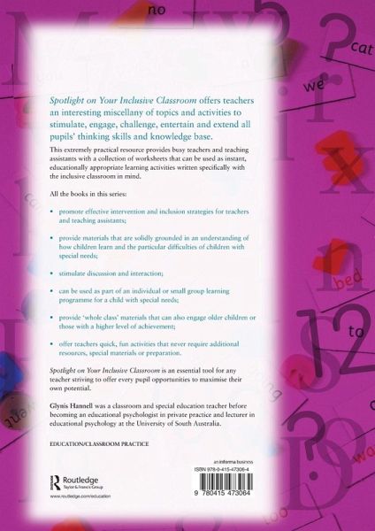 Spotlight on Your Inclusive Classroom offers teachers an interesting miscellany of topics and activities to stimulate, engage, challenge, entertain and extend all pupils' thinking skills and knowledge base. This extremely practical resource provides busy teachers and teaching assistants with a collection of worksheets that can be used as instant, educationally appropriate learning activities written specifically with the inclusive classroom in mind. All the books in this series: promote effective intervention and inclusion strategies for teachers and teaching assistants provide materials that are solidly grounded in an understanding of how children learn and the particular difficulties of children with special needs. stimulate discussion and interaction can be used as part of an individual or small group learning programme for a child with special needs provide 'whole class' materials that can also engage older children or those with a higher level of achievement offer teachers quick, fun activities that never require additional resources, special materials or preparation. Spotlight on Your Inclusive Classroom is an essential tool for any teacher striving to offer every pupil opportunities to maximise their own potential.