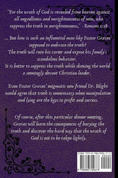 "For the wrath of God is revealed from heaven against all ungodliness and unrighteousness of men, who suppress the truth in unrighteousness." - Romans 1:18 ... But how is such an influential man like Pastor Graves supposed to embrace the truth? The truth will ruin his career and expose his family's scandalous behavior. It is better to suppress the truth while showing the world a seemingly devout Christian leader as that is the way to profit and success. Which is what Pastor Graves believed until his abrupt fall from grace. Seemingly out of other options, Graves agrees to a dinner meeting with a potential new colleague named Dr. Blight with the intentions of making a strong comeback to the church pulpit, but this dinner meeting is not as straightforward as Graves expects. As these two men spend the evening discussing various topics of sin and immorality, Graves will come to realize that he and Dr. Blight have more in common than he realized and not in the way he would ever imagine. Graves will also learn the consequences of burying the truth and discover the hard way that the wrath of God is not to be taken lightly, and the esteem of the world is not worth his soul.