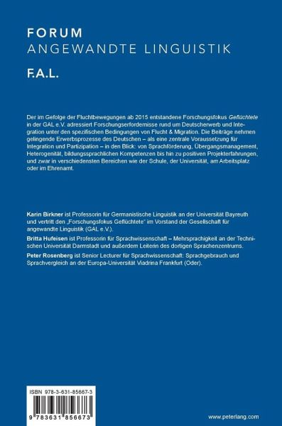 Karin Birkner ist Professorin für Germanistische Linguistik an der Universität Bayreuth und vertritt den «Forschungsfokus Geflüchtete» im Vorstand der Gesellschaft für angewandte Linguistik (GAL e.V.). Britta Hufeisen ist Professorin für Sprachwissenschaft - Mehrsprachigkeit an der Technischen Universität Darmstadt und außerdem Leiterin des dortigen Sprachenzentrums. Peter Rosenberg ist Senior Lecturer für Sprachwissenschaft: Sprachgebrauch und Sprachvergleich an der Europa-Universität Viadrina Frankfurt (Oder).