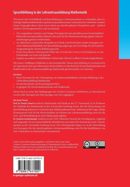 bietet Konzepte für die Verknüpfung von Mathematikdidaktik und Sprachbildung in der Lehrkräfteausbildung Mathematik,ist interdisziplinär und forschungsorientiert,ist geeignet für Hochschuldozierende und Studierende.Das Buch ist unter den Bedingungen der Creative Commons Attribution 4.0 International License über SpringerLink (link.springer.com) frei zugänglich.