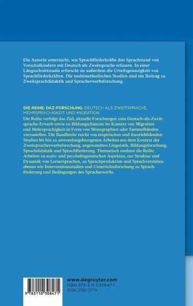 Die Autorin untersucht, wie Sprachförderkräfte den Sprachstand von Vorschulkindern mit Deutsch als Zweitsprache erfassen. In einer Längsschnittstudie erforscht sie außerdem die Urteilsgenauigkeit von Sprachförderkräften. Die multimethodischen Studien sind ein Beitrag zu Zweitsprachdidaktik und Spracherwerbsforschung.