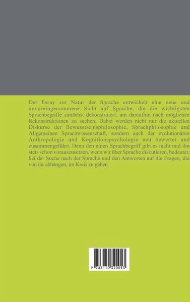 Der Essay zur Natur der Sprache entwickelt eine neue und unvoreingenommene Sicht auf Sprache, die die wichtigsten Sprachbegriffe zunächst dekonstruiert, um daraufhin nach möglichen Rekonstruktionen zu suchen. Dabei werden nicht nur die aktuellen Diskurse der Bewusstseinsphilosophie, Sprachphilosophie und Allgemeinen Sprachwissenschaft, sondern auch der evolutionären Anthropologie und Kognitionspsychologie neu bewertet und zusammengeführt. Denn den einen Sprachbegriff gibt es nicht und ihn stets schon vorauszusetzen, wenn wir über Sprache diskutieren, bedeutet, bei der Suche nach der Sprache und den Antworten auf die Fragen, die von ihr abhängen, im Kreis zu gehen.