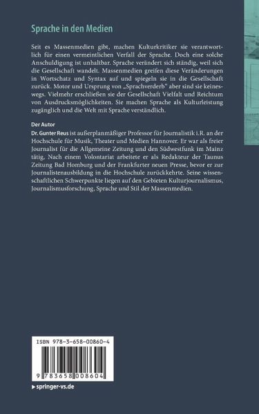 Einstieg: Sprachverfall oder Sprachwandel?.- Aufbau des Bandes.- Warum und wie verändert sich Sprache?.- Verständlichkeit und Demokratisierung: Sprachleistungen des Journalismus.- Exklusiv und emotional: Sprache im Internet.- Kreativ und manipulativ: Sprache in Werbung und Propaganda.- Fazit und Ausblick.- Zum Weiterlesen.- Glossar.
