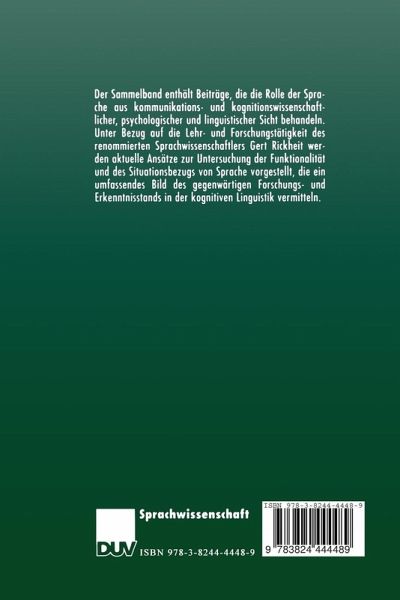 Der Sammelband enthält Beiträge, die die Rolle der Sprache aus kommunikations- und kognitionswissenschaftlicher, psychologischer und linguistischer Sicht behandeln. Unter Bezug auf die Lehr- und Forschungstätigkeit des renommierten Sprachwissenschaftlers Gert Rickheit werden aktuelle Ansätze zur Untersuchung der Funktionalität und des Situationsbezugs von Sprache vorgestellt, die ein umfassendes Bild des gegenwärtigen Forschungs- und Erkenntnisstands in der kognitiven Linguistik vermitteln.