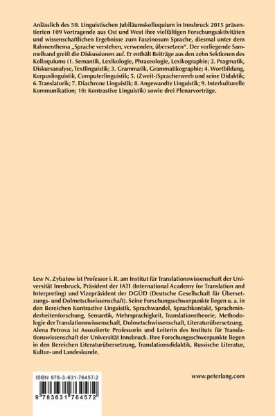 Anlässlich des 50. Linguistischen Jubiläumskolloquium in Innsbruck 2015 präsentierten 109 Vortragende aus Ost und West ihre vielfältigen Forschungsaktivitäten und wissenschaftlichen Ergebnisse zum Faszinosum Sprache, diesmal unter dem Rahmenthema «Sprache verstehen, verwenden, übersetzen». Der vorliegende Sammelband greift die Diskussionen auf. Er enthält Beiträge aus den zehn Sektionen des Kolloquiums (1. Semantik, Lexikologie, Phraseologie, Lexikographie; 2. Pragmatik, Diskursanalyse, Textlinguistik; 3. Grammatik, Grammatikographie; 4. Wortbildung, Korpuslinguistik, Computerlinguistik; 5. (Zweit-)Spracherwerb und seine Didaktik; 6. Translatorik; 7. Diachrone Linguistik; 8. Angewandte Linguistik; 9. Interkulturelle Kommunikation; 10: Kontrastive Linguistik) sowie drei Plenarvorträge.