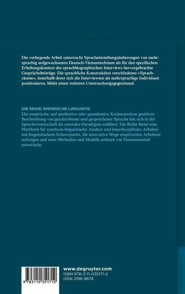 Die Arbeit widmet sich auf Basis eines Korpus von 14 sprachbiographischen Interviews außerdem der Frage, wie sich die interviewten Deutsch-VietnamesInnen - eine bislang in der Migrationslinguistik vernachlässigte Gruppe - in ihren Spracheinstellungsäußerungen gegenüber der Interviewerin positionieren. Spezifisch wird betrachtet, welche "Sprachräume" die Interviewten als relevant konstruieren und wie sie sich innerhalb dieser Sprachräume als mehrsprachige Individuen verorten.