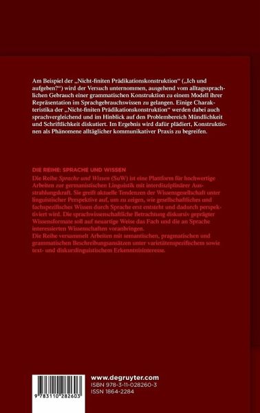 Am Beispiel der "Nicht-finiten Prädikationskonstruktion" (z.B. "Ich und aufgeben?") wird der Versuch unternommen, ausgehend von den alltagssprachlichen Formen und Funktionen einer grammatischen Konstruktion zu einem Modell ihrer Repräsentation im Sprachgebrauchswissen zu gelangen. Die Hauptdatengrundlage der Untersuchung bilden alltagssprachliche Beispiele aus dem Usenet und aus Foren. Im Anschluss an die Diskussion des Forschungsstands werden in Auseinandersetzung mit kognitions- und interaktionslinguistischen, aber auch zeichentheoretischen Positionen die theoretischen und methodologischen Konzepte herausgearbeitet, die für die Untersuchung der "Nicht-finiten Prädikationskonstruktion" erforderlich sind. Die empirische Untersuchung der Konstruktion mündet dann wiederum in einen Vorschlag für ein Modell ihrer kognitiven Repräsentation im Sprachgebrauchswissen. Nach einem Ausblick auf einige Charakteristika der "Nicht-finiten Prädikationskonstruktion", die in sprachvergleichender Hinsicht und im Hinblick auf den Problembereich Mündlichkeit und Schriftlichkeit aufschlussreich sind, schließt die Untersuchung mit einem Plädoyer dafür, Konstruktionen als Phänomene alltäglicher kommunikativer Praxis zu begreifen.