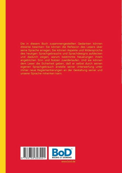 Die in diesem Buch zusammengestellten Gedanken können dreierlei bewirken: Sie können die Reflexion des Lesers über seine Sprache anregen. Sie können Aspekte und Widersprüche des heutigen Sprachgebrauchs und Sprachdesigns aufdecken und dadurch zeigen, warum bestimmte Neuerungen ihrem angeblichen Sinn und Nutzen zuwiderlaufen. Und sie können dem Leser die Sicherheit geben, daß er selbst durch seinen eigenen Sprachgebrauch anstelle seiner Unterwerfung unter immer neue Reglementierungen an der Gestaltung seiner und unserer Sprache mitwirken kann.