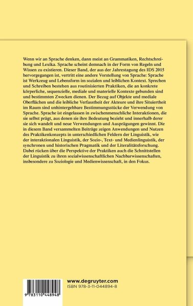 Dieser Band, der aus der Jahrestagung des IDS 2015 hervorgegangen ist, vertritt eine andere Vorstellung von Sprache: Sprache ist Werkzeug und Lebensform im sozialen und leiblichen Kontext. Sprechen und Schreiben bestehen aus routinisierten Praktiken, die an konkrete körperliche, sequenzielle, mediale und materielle Kontexte gebunden sind und bestimmten Zwecken dienen. Der Bezug auf Objekte und mediale Oberflächen und die leibliche Verfasstheit der Akteure und ihre Situiertheit im Raum sind unhintergehbare Bestimmungsstücke der Verwendung von Sprache. Sprache ist eingelassen in zwischenmenschliche Interaktionen, die sie selbst prägt, aus denen sie ihre Bedeutung bezieht und innerhalb derer sie sich wandelt und neue Verwendungen und Ausprägungen gewinnt.