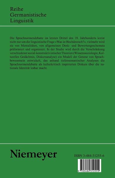 The language-norm debate in the last third of the 18th century did not revolve solely around the linguistic question "What is High German?" Rather, it was preformed and organized by mentalities, general schemata of thought and evaluation. By collapsing a number of different social-constructivist theories (sociology of knowledge, cultural memory, discourse analysis), the study develops a model of the genesis of language awareness that draws on deep-semantic analyses to enable us to read the language-norm debate as a discourse on national identity inspired by cultural criticism.