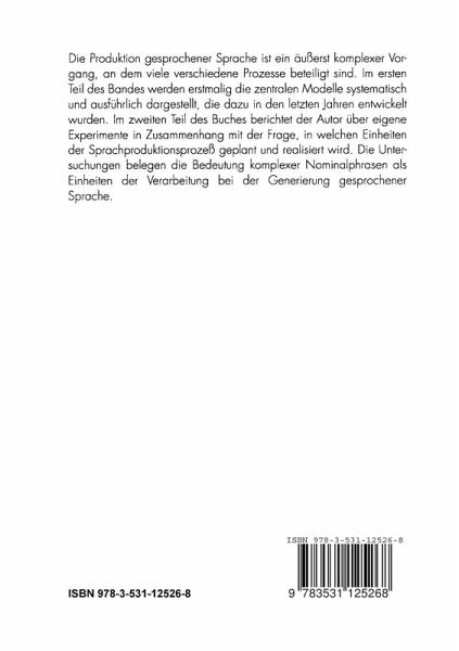 Die Produktion gesprochener Sprache ist ein äußerst komplexer Vorgang, an dem viele verschiedene Prozesse beteiligt sind. Im ersten Teil des Bandes werden die zentralen Modelle systematisch und ausführlich dargestellt. Im zweiten Teil des Buches berichtet der Autor über eigene Experimente in Zusammenhang mit der Frage, in welchen Einheiten der Sprachproduktionsprozeß geplant und realisiert wird. Die Untersuchungen belegen die Bedeutung komplexer Nominalphrasen als Einheiten der Verarbeitung bei der Generierung gesprochener Sprache.