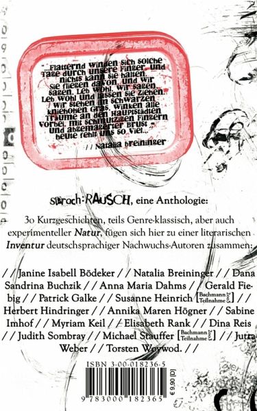 sprach:RAUSCH, eine Anthologie: 30 Kurzgeschichten, teils Genre-klassisch, aber auch experimenteller Natur, fügen sich hier zu einer literarischen Inventur deutschsprachiger Nachwuchs-Autoren zusammen. Mit Beiträgen von Susanne Heinrich (Ingeborg Bachmann-Teilnahme 2005), Michael Stauffer (Ingeborg Bachmann-Teilnahme 2003), Janine Isabell Bödeker, Natalia Breininger, Dana Sandrina Buchzik, Anna Maria Dahms, Gerald Fiebig, Patrick Galke, Herbert Hindringer, Annika Maren Högner, Sabine Imhof, Myriam Keil, Elisabeth Rank, Dina Reis, Judith Sombray, Jutta Weber und Torsten Woywod.