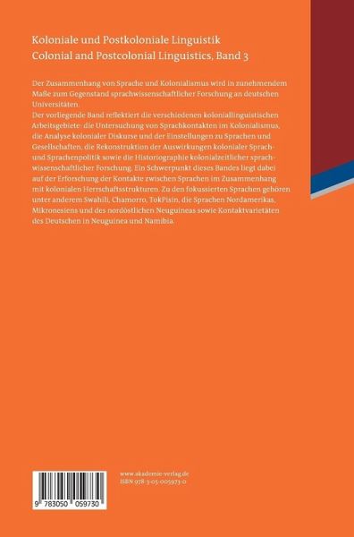 Der Zusammenhang von Sprache und Kolonialismus wird in zunehmendem Maße zum Gegenstand sprachwissenschaftlicher Forschung an deutschen Universitäten. Der vorliegende Band reflektiert die verschiedenen koloniallinguistischen Arbeitsgebiete: die Untersuchung von Sprachkontakten im Kolonialismus, die Analyse kolonialer Diskurse und der Einstellungen zu Sprachen und Gesellschaften, die Rekonstruktion der Auswirkungen kolonialer Sprach- und Sprachenpolitik sowie die Historiographie kolonialzeitlicher sprachwissenschaftlicher Forschung. Ein Schwerpunkt dieses Bandes liegt dabei auf der Erforschung der Kontakte zwischen Sprachen im Zusammenhang mit kolonialen Herrschaftsstrukturen. Zu den fokussierten Sprachen gehören unter anderem Swahili, Chamorro, TokPisin, die Sprachen Nordamerikas, Mikronesiens und des nordöstlichen Neuguineas sowie Kontaktvarietäten des Deutschen in Neuguinea und Namibia.