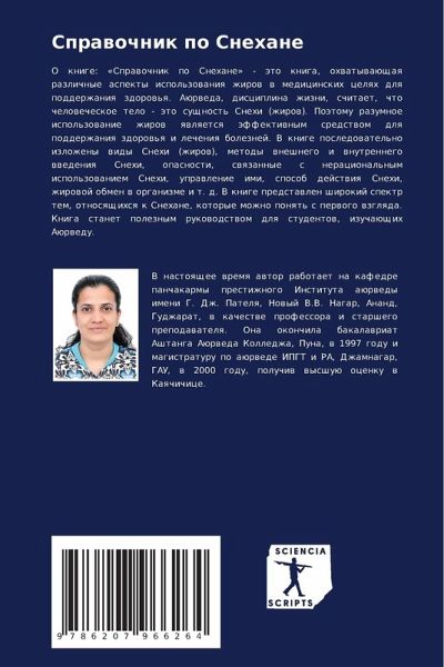 O knige: «Sprawochnik po Snehane» - äto kniga, ohwatywaüschaq razlichnye aspekty ispol'zowaniq zhirow w medicinskih celqh dlq podderzhaniq zdorow'q. Aürweda, disciplina zhizni, schitaet, chto chelowecheskoe telo - äto suschnost' Snehi (zhirow). Poätomu razumnoe ispol'zowanie zhirow qwlqetsq äffektiwnym sredstwom dlq podderzhaniq zdorow'q i lecheniq boleznej. V knige posledowatel'no izlozheny widy Snehi (zhirow), metody wneshnego i wnutrennego wwedeniq Snehi, opasnosti, swqzannye s neracional'nym ispol'zowaniem Snehi, uprawlenie imi, sposob dejstwiq Snehi, zhirowoj obmen w organizme i t. d. V knige predstawlen shirokij spektr tem, otnosqschihsq k Snehane, kotorye mozhno ponqt' s perwogo wzglqda. Kniga stanet poleznym rukowodstwom dlq studentow, izuchaüschih Aürwedu.