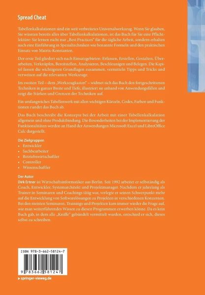 Tabellenkalkulationen sind ein weit verbreitetes Universalwerkzeug, um Daten tabellarisch bzw. grafisch darzustellen. Sie glauben, Sie wüssten bereits alles über Tabellenkalkulationen? Dann ist Dirk Ertners "Spread Cheat" eine echte Pflichtlektüre für Sie. Mit Hilfe seines detailliert geschriebenen Buchs können Sie viel Neues dazulernen und sich noch tiefergehendes Wissen auf dem Gebiet der Tabellenkalkulationen aneignen: Sie lernen "Best Practices" für die tägliche Arbeit im Bereich der Tabellenkalkulation.Sie machen sich mit dem praktischen Einsatz von Matrix-Konstanten vertraut.Sie erhalten eine Einführung in Spezialtechniken der Tabellenkalkulation wie zum Beispiel benannte Formeln. Damit eignet sich Ertners Tabellenkalkulations-Buch perfekt für Entwickler, Sachbearbeiter, Betriebswirtschaftler, Controller und Wissenschaftler.