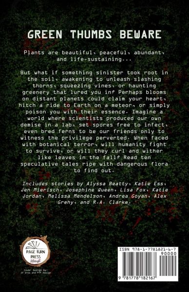 GREEN THUMBS BEWARE Plants are beautiful, peaceful, abundant, and life-sustaining... But what if something sinister took root in the soil, awakening to unleash slashing thorns, squeezing vines, or haunting greenery that lured you in? Perhaps blooms on distant planets could claim your heart, hitch a ride to Earth on a meteor, or simply poison you with their essence. Imagine a world where scientists produced our own demise in a lab, set spores free to infect, even bred ferns to be our friends only to witness the privilege perverted. When faced with botanical terror, will humanity fight to survive, or will they curl and wither like leaves in the fall? Read ten speculative tales ripe with dangerous flora to find out. Includes stories by: Alyssa Beatty Katie Ess Jon Mierisch Josephine Queen Lisa Fox Katie Jordan Melissa Mendelson Andrea Goyan Alex Grehy R.A. Clarke Foreword by: Holly Rae Garcia