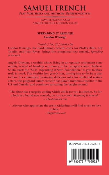 Londos D'Arrigo, the hard-hitting comedy writer for Phyllis Diller, Lily Tomlin, and Joan Rivers, brings the sensational new comedy, Spreading It Around. Angela Drayton, a wealthy widow living in an up-scale retirement community, is tired of handing out money to her unappreciative children. So she starts the "S.I.N. (Spending It Now) Foundation," to give to those truly in need. This terrifies her greedy son, driving him to devise a plan to have her committed. Featuring delicious roles fo