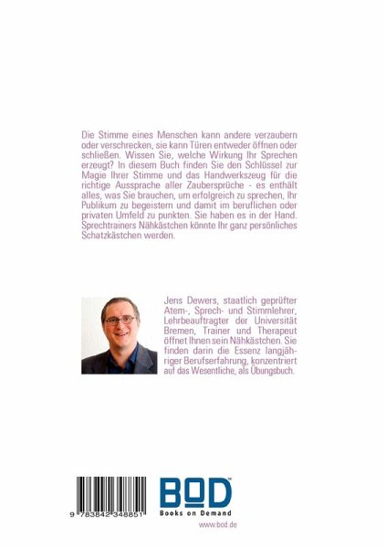 Die Stimme kann Menschen verzaubern oder verschrecken, sie kann Türen öffnen und Türen schließen. Wissen Sie, welche Wirkung Ihr Sprechen erzeugt? In diesem Buch finden Sie den Schlüssel zur Magie Ihrer Stimme und das Handwerkszeug für die richtige Aussprache aller Zaubersprüche - es enthält alles, was Sie brauchen, um erfolgreich zu sprechen, Ihr Publikum zu begeistern und damit im beruflichen oder privaten Umfeld zu punkten. Sie haben es in der Hand. Sprechtrainers Nähkästchen könnte Ihr ganz persönliches Schatzkästchen werden.