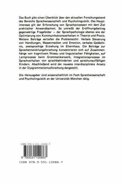 Das Buch gibt einen Überblick über den aktuellen Forschungsstand des Bereichs Sprechwissenschaft und Psycholinguistik. Das Hauptinteresse gilt der Erforschung von Sprachprozessen mit dem Ziel praktischer Anwendbarkeit. So umreißt der Eröffnungsbeitrag gegenwärtige Fragefelder - der Sprachpathologie ebenso wie der Optimierung von Kommunikationsverhalten in Theorie und Praxis. Weitere Beiträge vertiefen die Problemsicht: Verbale Steuerung von Handlungen, Massenmedien und Emotion, verbales Gedächtnis, zweisprachige Erziehung im Elternhaus. Die Beiträge zur Sprachentwicklungs-forschung konzentrieren sich auf Zusammenhänge von kognitivem Niveau und linguistischen Fähigkeiten, auf Lernprozesse beim Grammatikerwerb, Integrationsprozesse im Sprachverhalten von sprachbehinderten und sprachunauffälligen Kindern. Anschließend wird der neueste interdisziplinäre Ansatz in der Dysgrammatismusforschung dargestellt.