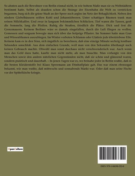So ahnten auch die Bewohner von Berlin einmal nicht, in wie hohem Maße man sie zu Weltstädtern bestimmt hatte. Selbst als draußen schon die Stränge der Eisenbahn die Welt zu verstricken begannen, barg sich die grüne Stadt an der Spree noch arglos im Netz der Behaglichkeit. Neben den niedern Giebelhäusern reiften Kohl und Johannisbeeren. Unter schattigen Bäumen trank man seinen Milchkaffee. Und zwar in langsam bekömmlichen Schlücken. Tief waren die Tassen, groß die Semmeln, lang die Pfeifen. Ruhig die Straßen, friedlich die Plätze. Dick und fest die Grenzmauern. Keinem Berliner wäre es damals eingefallen, durch die Luft fliegen zu wollen. Gemessen und sorgsam bewegte man sich über das holprige Pflaster. Im Sommer hatte man Gras und Wiesenblumen auszubiegen. Im Winter verboten Schlamm oder Glatteis jede übertriebene Eile. Keinem kam es in den Sinn, sich ängstlich zu berechnen, daß eine einzige Minute sechzig kostbare Sekunden umschloß. Aus dem einfachen Grunde, weil man von den Sekunden überhaupt noch keinen Gebrauch machte. Obwohl man sonst durchaus nicht verschwenderisch war. Auch wenn man das Geld dazu hatte, kaufte man nicht mehr, als man brauchte. Man verlangte von den Menschen sowie den andern nützlichen Gegenständen nicht, daß sie schön und glänzend waren, sondern praktisch und dauerhaft. ¿ In jenen Tagen war es, wo beinahe jeder in Berlin wußte, daß es die besten Kleiderstoffe bei Klaus Spreemann am Dönhoffplatz gab. Das war einem ebensogut bekannt, wie man wußte, daß mittwochs und sonnabends Markt war. Oder daß man seine Fische vor der Spittelkirche kriegte.