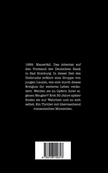 Ende der 80er Jahre in Deutschland. Eine Zeit des Umbruchs. Die Mauer in Berlin fällt, terroristische Gewalttaten passieren. Eine aufwühlende Zeit. In dieser Zeit begleiten die Leser eine Clique junger Menschen, auf welche die Ereignisse dieser Zeit ihr weiteres Leben lang
