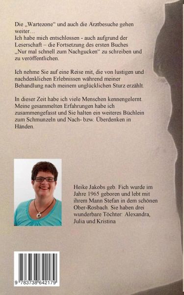 Die "Wartezone" und auch die Arztbesuche gehen weiter...Mein Buch: "Nur mal schnell zum Nachgucken" konnte nicht richtig beendet werden, da es noch kein wirkliches Ende gab. Vielmehr muss ich hier erklären, dass es zum Fertigstellen und Drucken des Buches noch kein Ende meiner Odysee mit Operationen, schlechtem Heilungsverlauf und Arzt- bzw. Klinikbesuchen in Sicht war. Deshalb habe ich mich entschlossen - auch aufgrund der Leserschaft - diesen sogenannten 2. Teil des Buches zu schreiben und zu veröffentlichen. Ich nehme Sie auf eine Reise mit, die von lustigen und nachdenklichen Erlebnissen während meiner Behandlung nach meinem unglücklichen Sturz im Juli erzählt. Viele Menschen habe ich in dieser Zeit kennengelernt: merkwürdige bis seltsame, witzige oder einfach nur liebenswerte und nette Personen. Meine gesammelten Erfahrungen habe ich zusammengefasst und Sie halten ein weiteres Büchlein zum Schmunzeln und Nach- bzw. Überdenken in Händen.Auch nach so einer langen Behandlungszeit bin ich ein immer noch positiv denkender Mensch und sage auch heute:Das Leben ist schön.