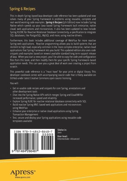 This in-depth Spring-based Java developer code reference has been updated and now solves many of your Spring Framework 6 problems using reusable, complete and real-world working code examples. Spring 6 Recipes (5th Edition) now includes Spring Native which speeds up your Java-based Spring Framework built enterprise, native cloud, web applications and microservices. It also has been updated to now include Spring R2DBC for Reactive Relational Database Connectivity, a specification to integrate SQL databases, like PostgreSQL, MySQL and more, using reactive drivers.