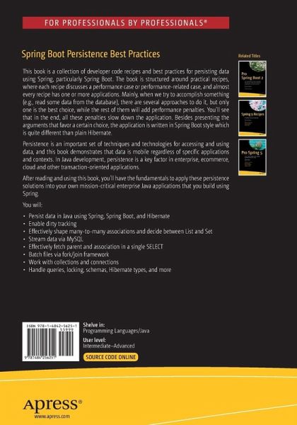 This book is a collection of developer code recipes and best practices for persisting data using Spring, particularly Spring Boot. The book is structured around practical recipes, where each recipe discusses a performance case or performance-related case, and almost every recipe has one or more applications. Mainly, when we try to accomplish something (e.g., read some data from the database), there are several approaches to do it, and, in order to choose the best way, you have to know the implied trades-off from a performance perspective. You'll see that in the end, all these penalties slow down the application. Besides presenting the arguments that favor a certain choice, the application is written in Spring Boot style which is quite different than plain Hibernate.