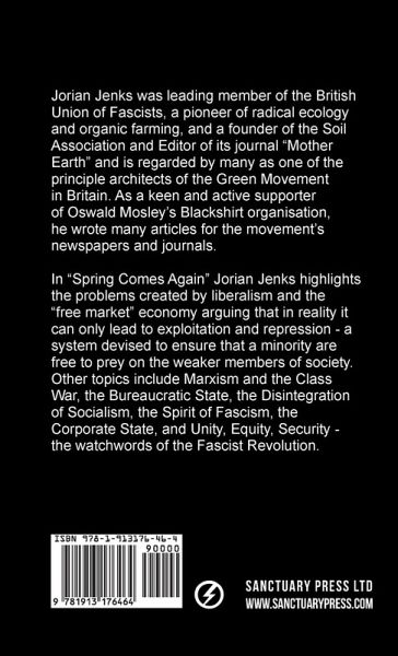 Jorian Jenks was leading member of the British Union of Fascists, a pioneer of radical ecology and organic farming, and a founder of the Soil Association and Editor of its journal "Mother Earth" and is regarded by many as one of the principle architects of the Green Movement in Britain. As a keen and active supporter of Oswald Mosley's Blackshirt organisation, he wrote many articles for the movement's newspapers and journals. In "Spring Comes Again" Jorian Jenks highlights the problems created by liberalism and the "free market" economy arguing that in reality it can only lead to exploitation and repression - a system devised to ensure that a minority are free to prey on the weaker members of society. Other topics include Marxism and the Class War, the Bureaucratic State, the Disintegration of Socialism, the Spirit of Fascism, the Corporate State, and Unity, Equity, Security - the watchwords of the Fascist Revolution. During World War Two, for opposing another war with Germany, he was imprisoned by the British government without charge or trial spending some time in the infamous torture centre at Latchmere House in Surrey.