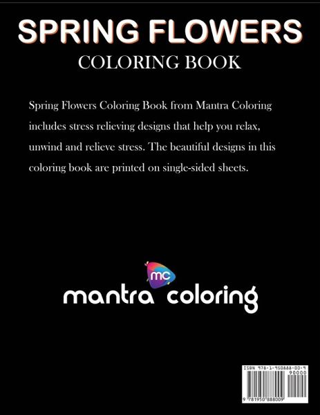 Spring Flowers Coloring Book from Mantra Coloring includes stress relieving designs that help you relax, unwind and relieve stress. The beautiful designs in this coloring book are printed on single-sided sheets.