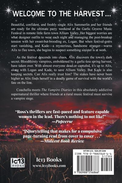 The "riveting" (Kirkus Reviews) BookTok sensation from bestselling author Rektok Ross that will "leave readers breathless and clamoring for more!" (Collider). A "deliciously scary and unforgettable experience that adds a new layer to vampire mythology!" -#1 New York Times bestselling author Melissa de la Cruz Coachella meets The Vampire Diaries in this absolutely addictive supernatural thriller where friends at a rural music festival must survive a vampire siege. Beautiful, confident, and freshly single Alix Summerlin and her friends are ready for the ultimate party weekend at the Garlic Groove Music Festival in remote little farm town Allium Valley. Her biggest worries are what designer outfits to wear each night and managing the post-breakup tension with her sweet-but-brooding ex, Logan. But when festival-goers start vanishing, and Kade-a mysterious, handsome stranger-warns Alix to flee town, she begins to suspect something sinister is at work. As the festival descends into chaos, Alix discovers the town's dark secret. Bloodthirsty vampires, emboldened by a garlic-less spring harvest, have taken over. With almost everyone dead or captured, it's up to Alix, along with Logan and Kade, to save Allium Valley. But Kade is also keeping secrets. Can Alix really trust him? The stakes have never been higher as Alix finds herself in a deadly game of survival with the world's fate on the line. Bestselling, award-winning author Rektok Ross returns with this action-packed, gripping new thriller for fans of: · Unputdownable and fast-paced thrillers, supernatural thrillers, paranormal thrillers, and romantic suspense fiction · Vampire books, urban legends, folklore, ancient curses, monsters · Apocalypse, outbreak, and survival stories · Creepy small towns and isolated, rural settings · Love triangles and touch-her-and-die alpha male romances · Binge-worthy TikTok BookTok books · Redeemable "mean girl" heroines you can't help but root for like Blair Waldorf, Chanel Oberlin, Cordelia Chase, Brooke Davis, Cher Horowitz, and Cheryl Blossom · Buffy the Vampire Slayer collides with Salem's Lot and The Lost Boys · James Patterson, Simone St. James, Dean Koontz, Colleen Hoover, Suzanne Collins, Charlaine Harris, Grady Hendrix, Darcy Coates, and Christopher Pike novels