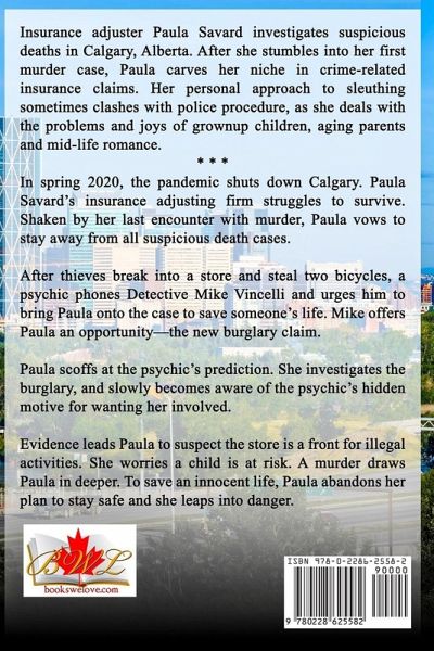 In spring 2020, the pandemic shuts down Calgary. Paula Savard's insurance adjusting firm struggles to survive. Shaken by her last encounter with murder, Paula vows to stay away from all suspicious death cases. After thieves break into a store and steal two bicycles, a psychic phones Detective Mike Vincelli and urges him to bring Paula onto the case to save someone's life. Mike offers Paula an opportunity-the new burglary claim. Paula scoffs at the psychic's prediction. She investigates the burglary, and slowly becomes aware of the psychic's hidden motive for wanting her involved. Evidence leads Paula to suspect the store is a front for illegal activities. She worries a child is at risk. A murder draws Paula in deeper. To save an innocent life, Paula abandons her plan to stay safe and she leaps into danger.