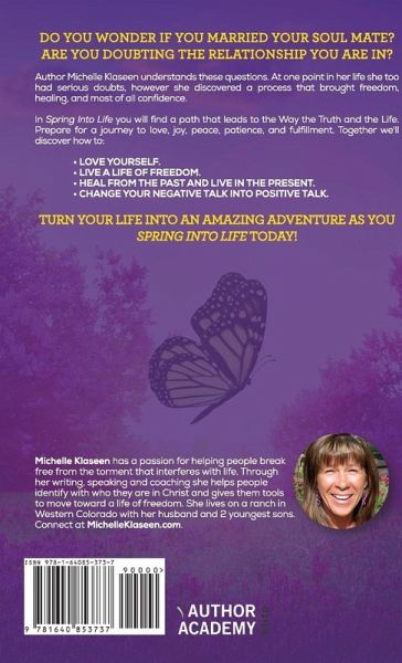 Do you wonder if you married your soulmate? Are you doubting the relationship you are in? Author Michelle Klaseen understands these questions. At one point in her life she too had serious doubts,however she discovered a process that brought freedom, healing and most of all confidence. In Spring Into Life you will find a path that leads to the Way the Truth and the Life. Prepare for a journey to love, joy, peace, and fulfillment. Together we'll discover how to: Love yourself, live a life of freedom, heal from the past and live in the present,change your negative talk into positive talk. Turn your life into an amazing adventure as you Spring Into Life today!