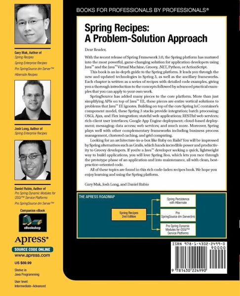 to Spring.- Advanced Spring IoC Container.- Spring AOP and AspectJ Support.- Scripting in Spring.- Spring Security.- Integrating Spring with Other Web Frameworks.- Spring Web Flow.- Spring @MVC.- Spring REST.- Spring and Flex.- Grails.- Spring Roo.- Spring Testing.- Spring Portlet MVC Framework.- Data Access.- Transaction Management in Spring.- EJB, Spring Remoting, and Web Services.- Spring in the Enterprise.- Messaging.- Spring Integration.- Spring Batch.- Spring on the Grid.- jBPM and Spring.- OSGi and Spring.